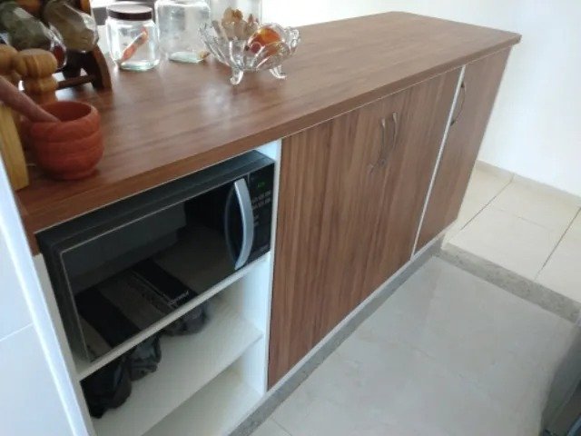 Cozinha americana recentemente reformada, com uma bela bancada de marcenaria.