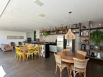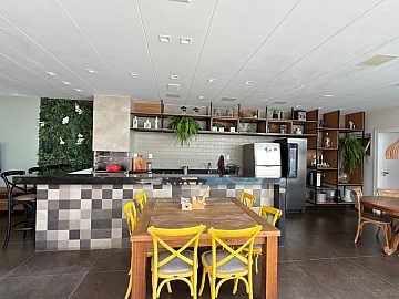 Cozinha: mesa e cadeiras, cooktop, exaustor, geladeira sider by sider, forno elétrico, micro ondas e modulado